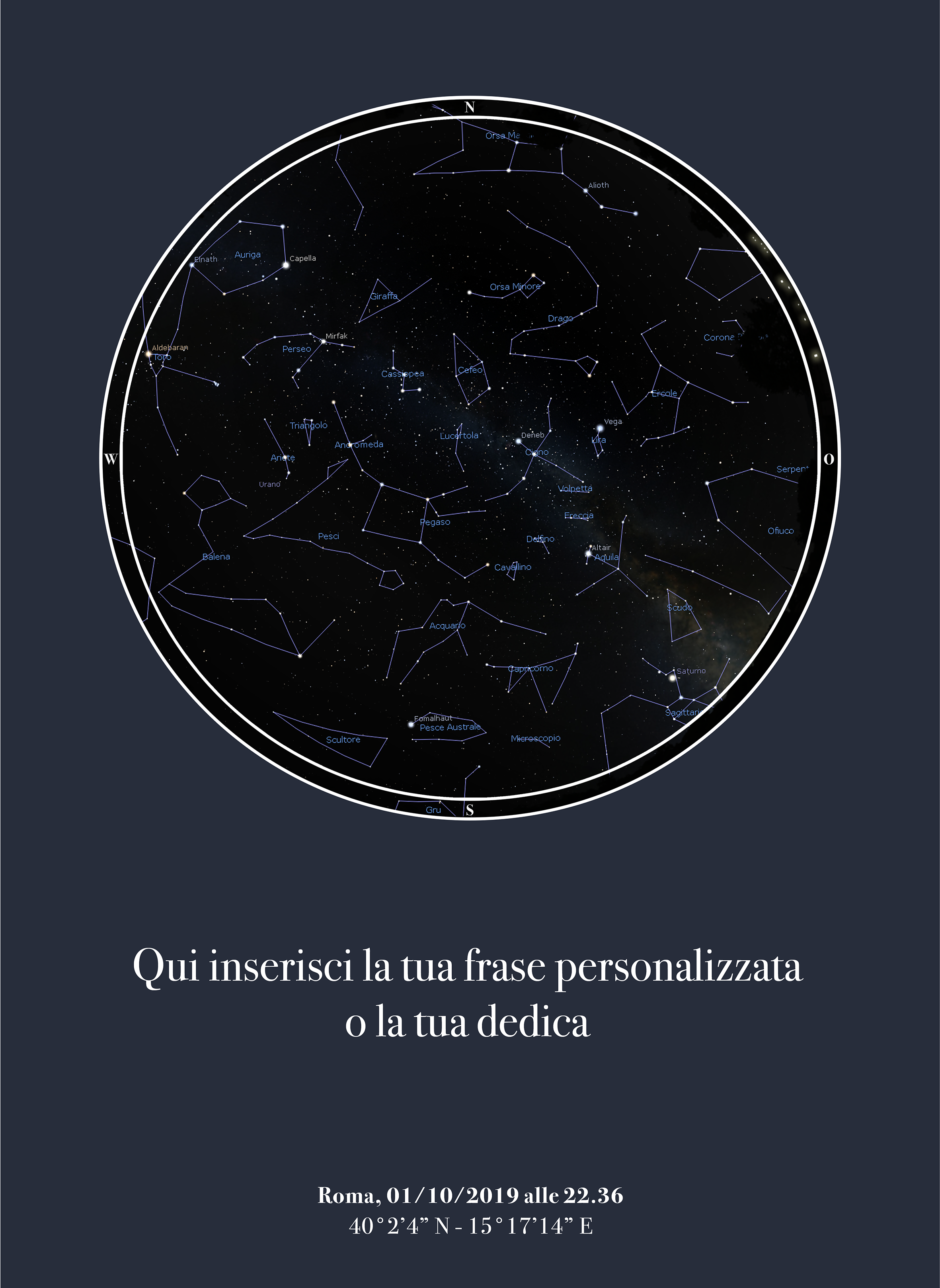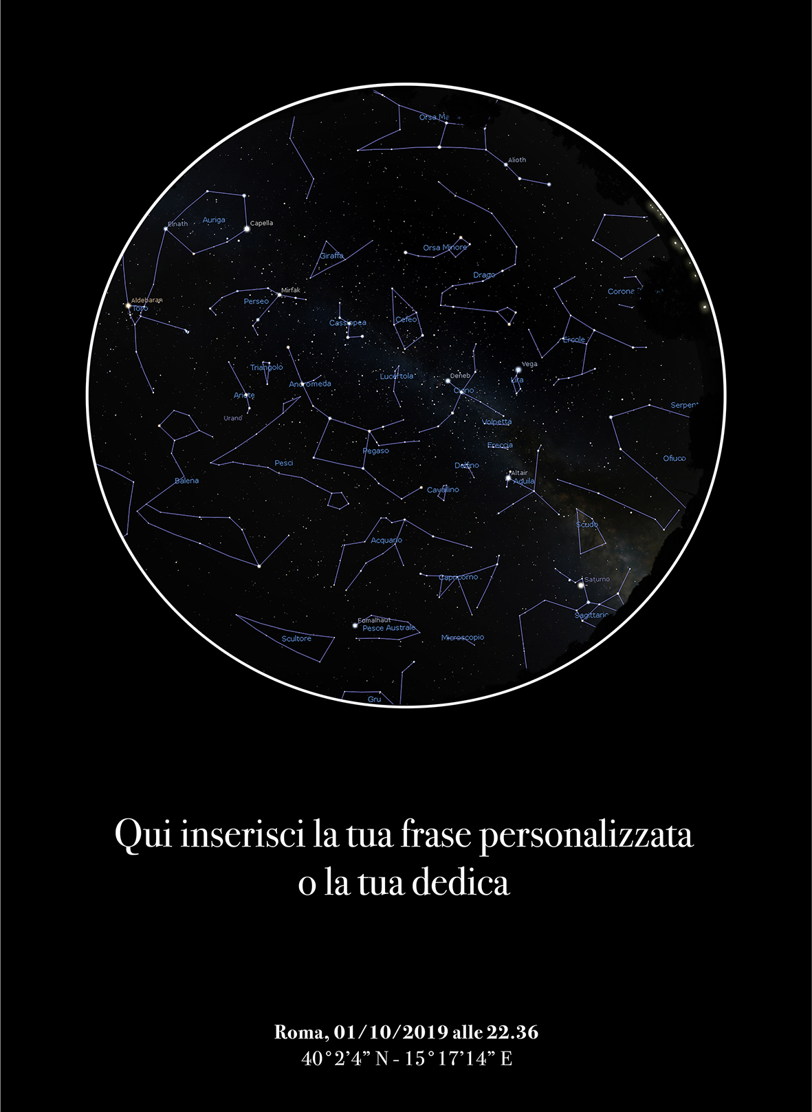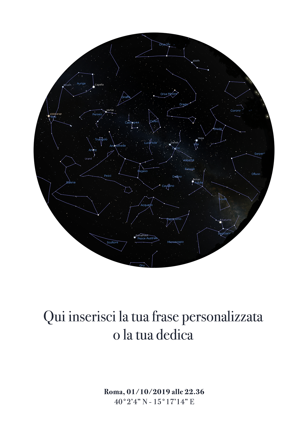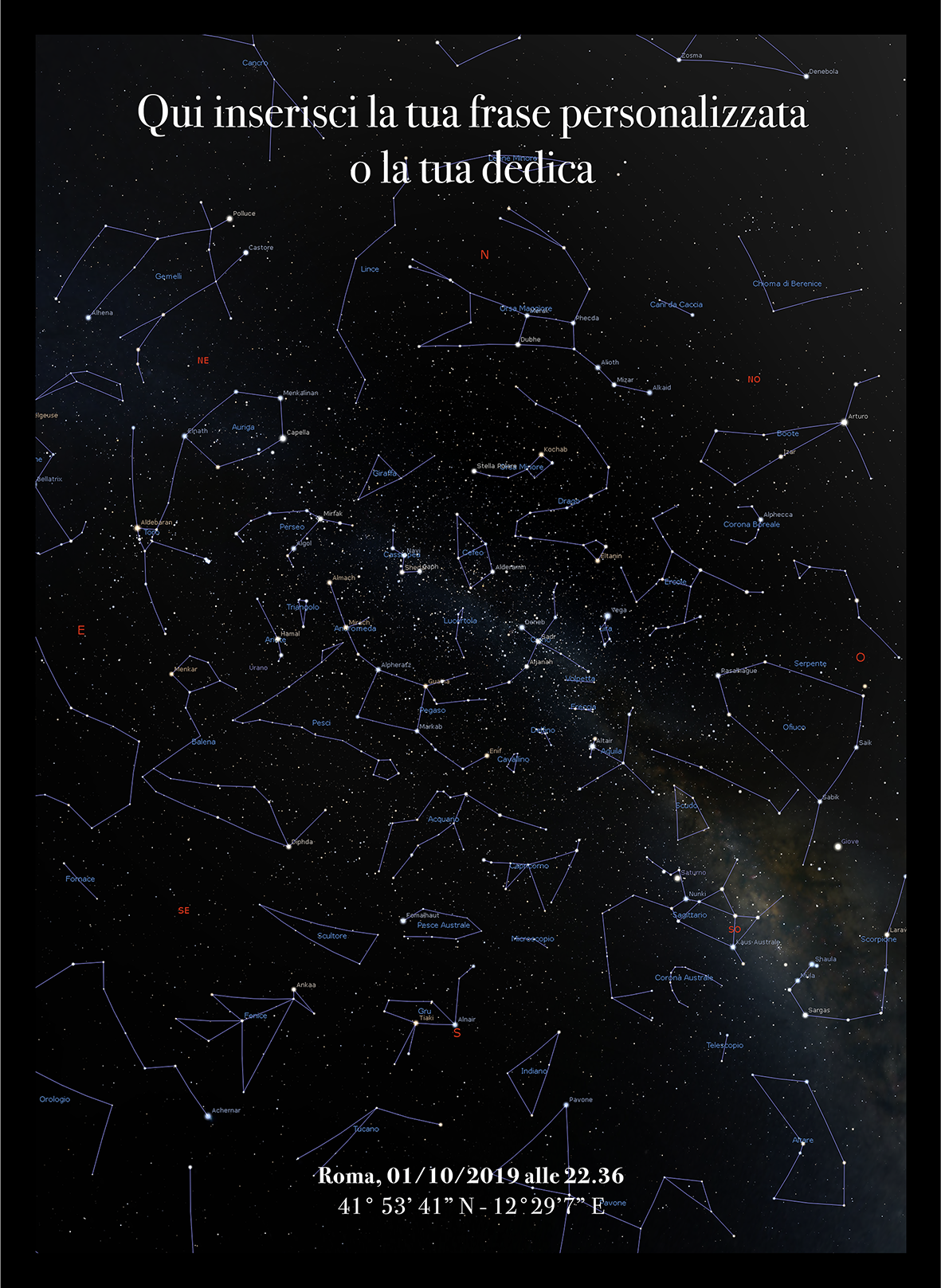 La tua mappa stellare sarà precisa al massimo! Utilizziamo, infatti, un potente software in grado di calcolare l'esatta posizione dei corpi celesti in un preciso istante, da qualsiasi luogo della terra.